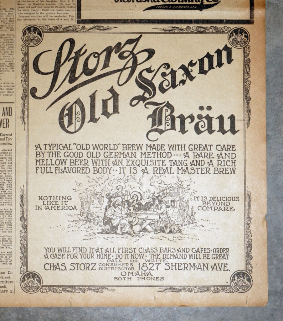 1911 Storz Old Saxon “A Typical “Old World” Brew” Ad
