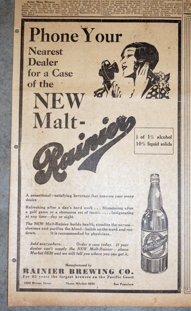 1929 Malt Rainier “Phone Your Nearest Dealer” Ad